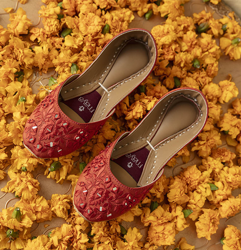 Asfana I is the epitome of handcrafted khussa and traditional workmanship. Same color hand embroidery with sheesha work on pure raw silk base.