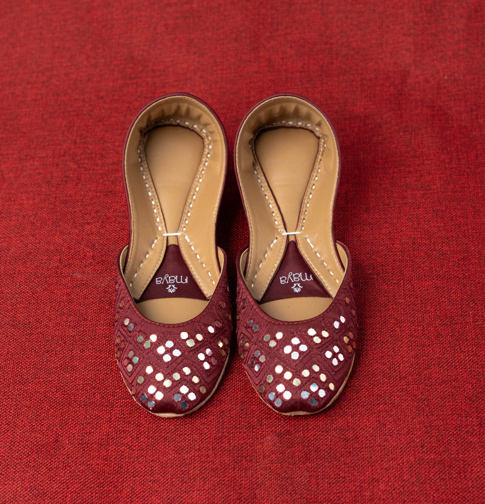 Afsana II is back, but this time in a different color. RED. A beautiful soft base with small circular mirror work hand embroidered in fluid pattern finished with silk thread. This pair is perfect for day wear when light reflects and bounces off the mirrors.