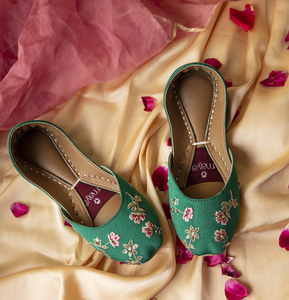 ChamCham is wrought with fine resham and sequins to render the pink flowers complementing the bright green pure raw silk base.