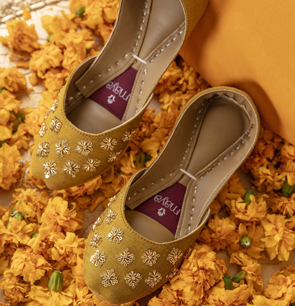 Chamak II is a gorgeous mustard pair with beautiful gold embellishments is sure to leave you star struck.The use of sitara and moti in motifs gives it traditional yet minimal look.