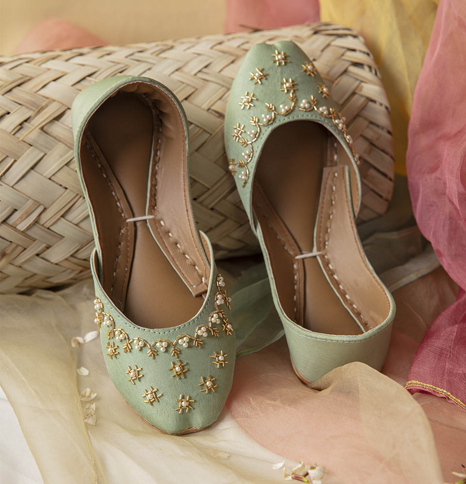 Moti is a beautiful shade of green with traditional pattern embellished with hand addawork. Moti, Dabka and pearl details are adorned with finest detail on raw silk base.