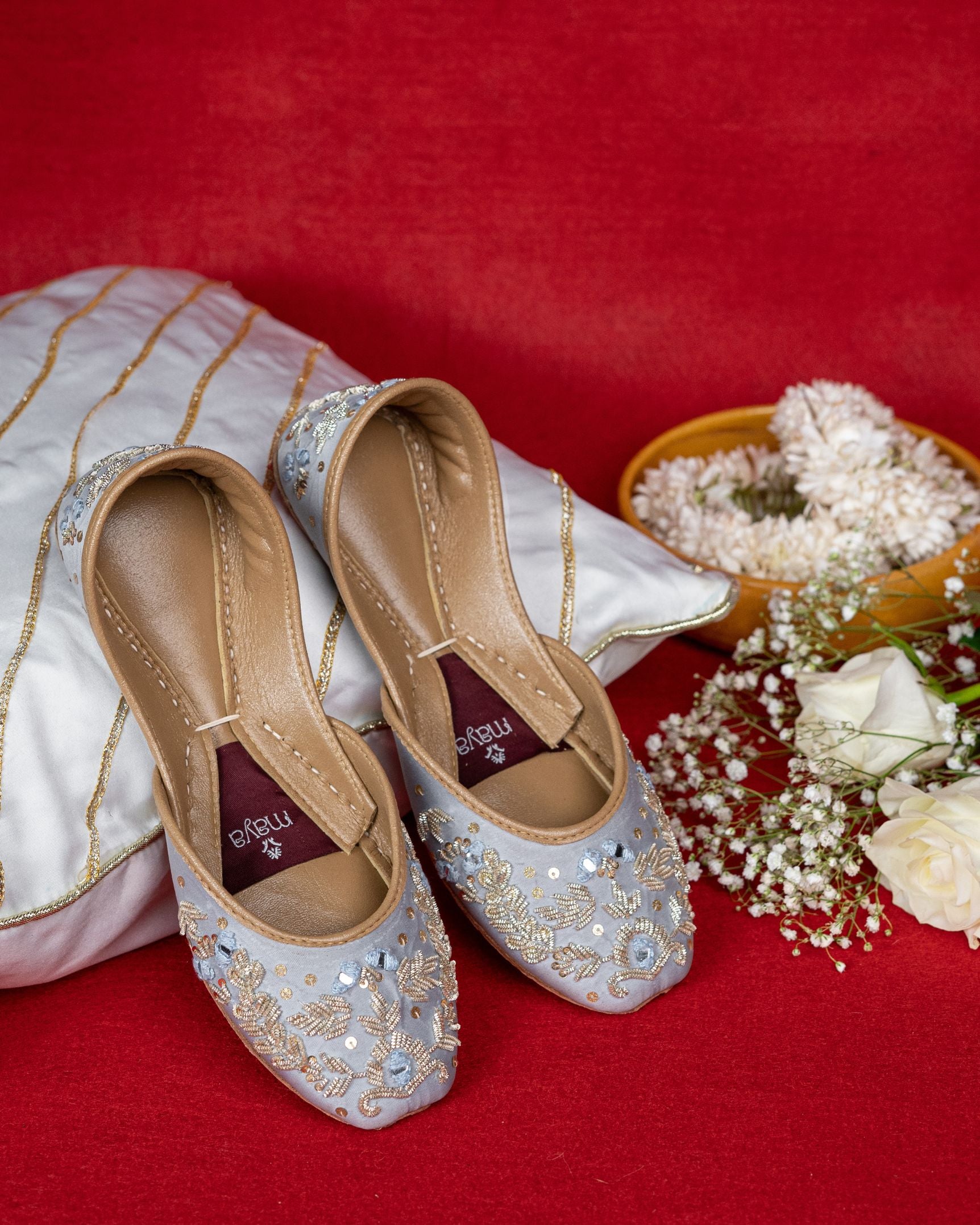 A dreamy lilac base with exquisite silver floral embroidery. Its soft tones and intricate detailing make it a statement piece for elegant occasions.