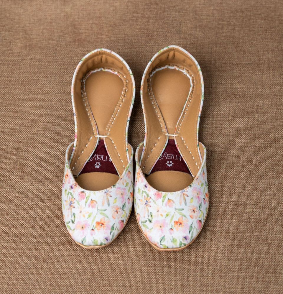 Introducing "Oeillet" - a captivating jutti adorned with vibrant yellow and pink blossoms on a pristine white base. Step into elegance and grace with every stride in these meticulously crafted floral wonders. Elevate your ensemble with the timeless allure of "Oeillet," where sophistication meets floral finesse