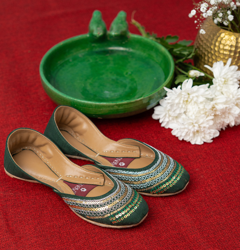 Green base hand-embroidered with gold sequins, embroidery and thread work along the cleavage add a dash of glam. Pair it with red, orange, yellow or cream outfits to create a contrasting look.